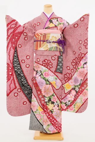 104-S-kaw0076 振袖レンタル Sサイズ 赤/絞り染 熨斗目草花文 振袖 〜13号 ..