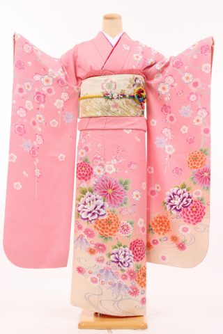104-M-kaw0081 振袖レンタル Mサイズ 桃色/流水に菊 振袖 ~13号 お客様:..