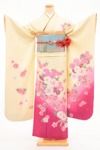 104-M-kaw0108 振袖レンタル Mサイズ クリーム/菊と桜 振袖 〜13号 お客様..