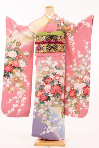 104-L-kaw0061 振袖レンタル Lサイズ ピンク絞り染/松に花模様 振袖 ~13号 ..