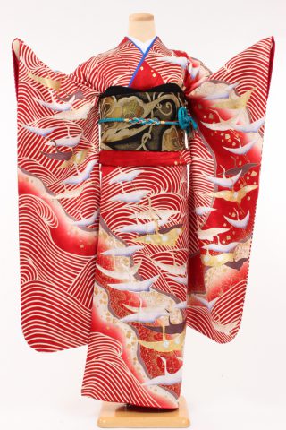 104-SO-kaw0005 振袖レンタル SOサイズ 赤/波に吉祥鶴 振袖 13号~15号 ..