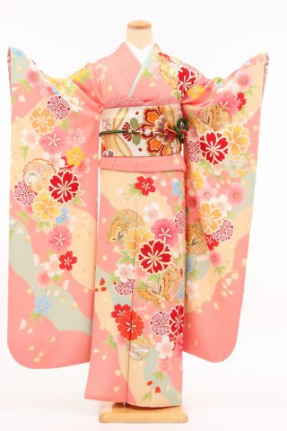 104-L-kaw0255 振袖レンタル Lサイズ サーモンピンク/雪輪に桜蝶 振袖 〜13号 ..