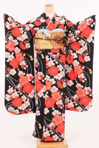 104-M-gaw0044 振袖レンタル Mサイズ 黒/梅尽くし/きもの道楽 振袖 ~13号 ..