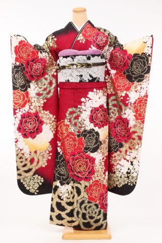 104-M-kaw0060 振袖レンタル Mサイズ ワイン/金薔薇 振袖 ~13号 10..