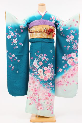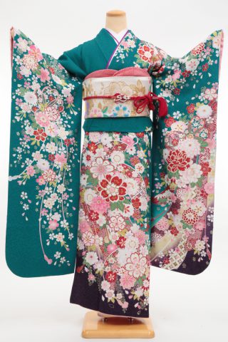 104-S-kaw0016 振袖レンタル Sサイズ 緑/まんまる八重桜 振袖 ~13号 お客..