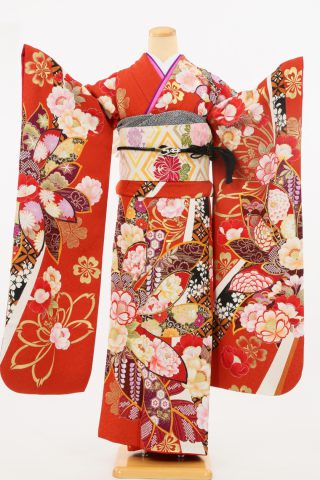 104-L-kaw0091 振袖レンタル Lサイズ 赤/流水に花祝い鶴/KANSAI 振袖 ~1..
