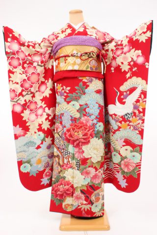 104-L-kaw0047 振袖レンタル Lサイズ 赤/花模様に御所車 振袖 ~13号 お客..