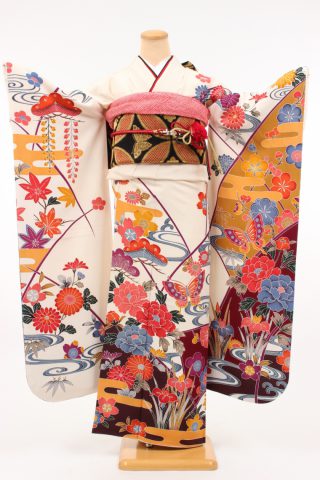 104-S-kaw0048 振袖レンタル Sサイズ クリーム/檜扇に牡丹 振袖 ~13号 お..