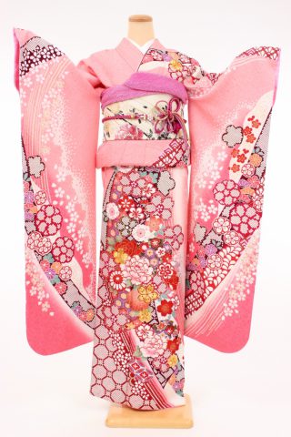 104-L-kaw0159 振袖レンタル Lサイズ ピンク/絞り染風 菊牡丹桜流し 振袖 ~13..