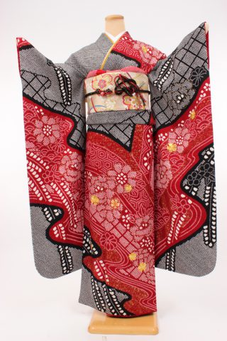 104-L-kaw0040 振袖レンタル Lサイズ 赤に黒絞り染め/藤と流水 振袖 ~13号 ..