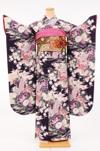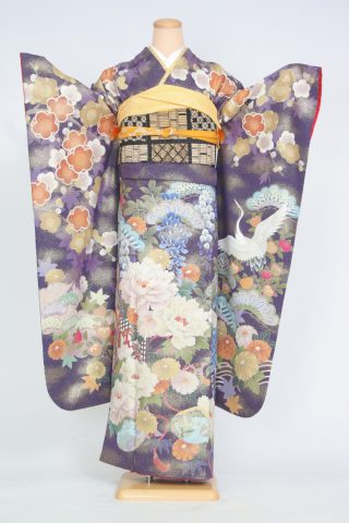 104-M-gaw0009 振袖レンタル Mサイズ 濃い紫/花模様に鶴 振袖 ~13号 お客..