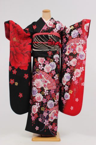 104-M-gaw0151 振袖レンタル Mサイズ 黒地/扇面華乱舞/JAPANSTYLE 振袖..