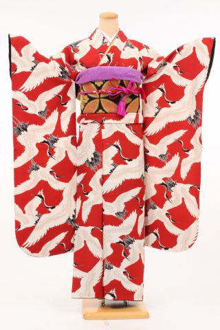 104-M-kaw0003 振袖レンタル Mサイズ 赤/祝い鶴 振袖 ~13号 お客様:E...
