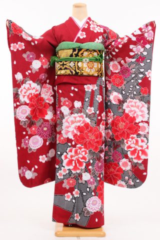 104-M-gaw0117 振袖レンタル Mサイズ 赤地/熨斗目模様に牡丹/H・L(アッシュエル..
