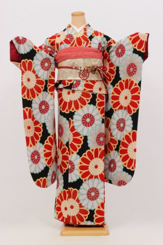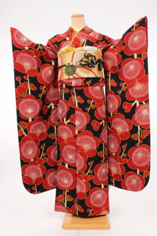 104-L-kaw0024 振袖レンタル Lサイズ 黒地/赤梅大 振袖 ~13号 お客様:K..