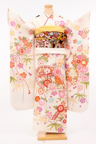 104-L-kaw0132 振袖レンタル Lサイズ 白/桧扇に花尽し 振袖 13号 104-..