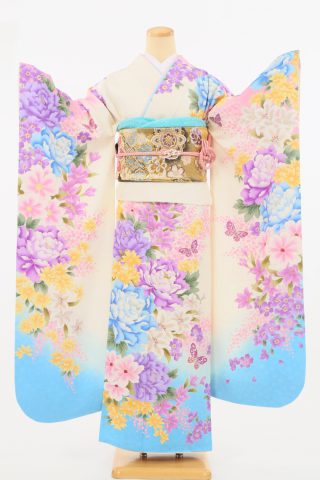 104-L-kaw0235 振袖レンタル Lサイズ ピンク水色ぼかし/花菱草花文様 振袖 ~13..