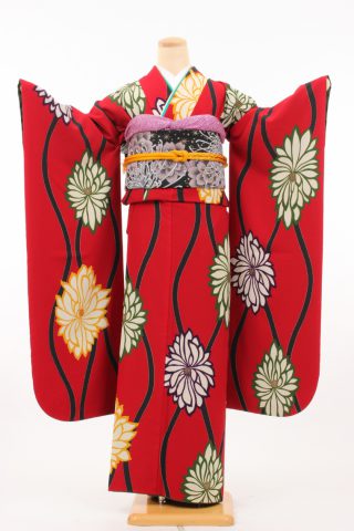 104-M-gaw0082 振袖レンタル Mサイズ 赤/立枠に菊菱/岡重 振袖 ~13号 お..