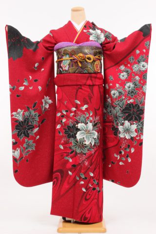 104-M-kaw0071 振袖レンタル Mサイズ 赤/モノクロ百合 振袖 ~13号 お客様..