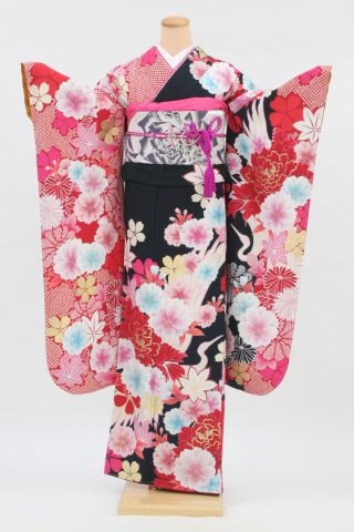 104-M-gaw0047 振袖レンタル Mサイズ 赤・黒/桜楓に鶴の舞/JAPANSTYLE ..