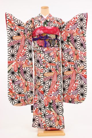 104-M-gaw0164 振袖レンタル Mサイズ 白エンジ/熨斗目に麻の葉模様/きもの道楽 振..