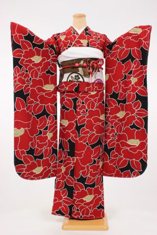 104-M-gaw0166 振袖レンタル Mサイズ 黒エンジ/黒椿大/和風館 振袖 ~13号 ..