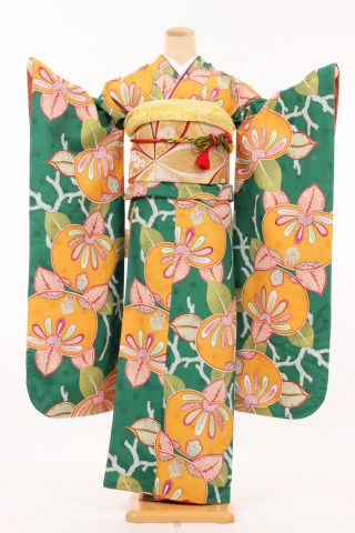 104-M-gaw0185 振袖レンタル Mサイズ 緑/橘文 振袖 ~13号 お客様:H.M..