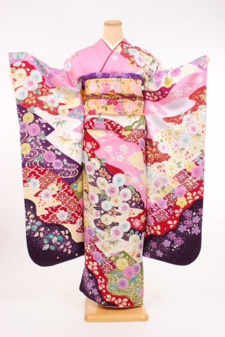 104-M-kaw0046 振袖レンタル Mサイズ ピンク/絞り染め松葉菱華文 振袖 ~13号 ..