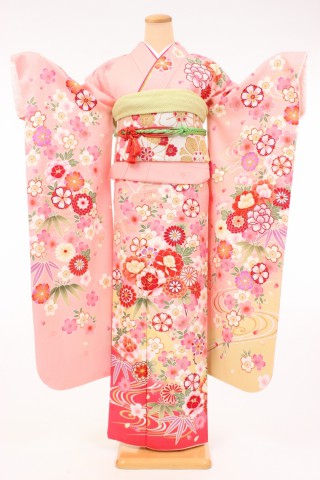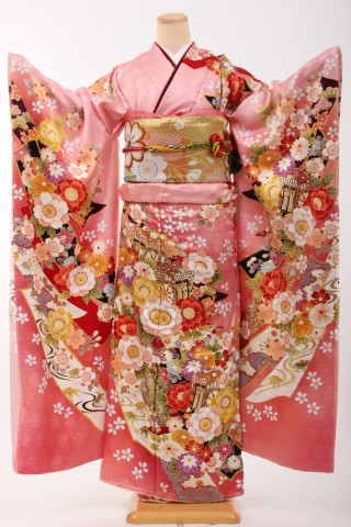 104-L-kaw0305 振袖レンタル Lサイズ ピンク/御所車に桜 振袖 ~13号 お客..