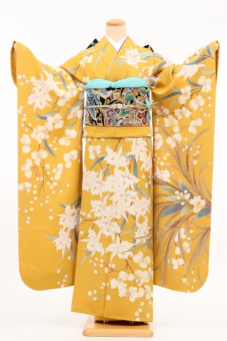 104-L-kaw0257 振袖レンタル Lサイズ 黄/カトレアと蘭 振袖 〜13号 お客様..