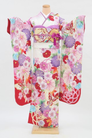 104-M-gaw0049 振袖レンタル Mサイズ 白/菊桜に蝶の舞/JAPANSTYLE 振袖..