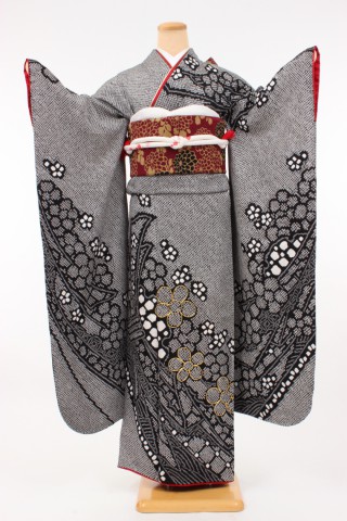 104-L-kaw0033 振袖レンタル Lサイズ 黒地絞り染め/束ね熨斗に桜 振袖 ~13号 ..