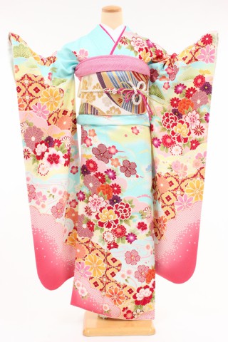 104-L-kaw0235 振袖レンタル Lサイズ ピンク水色ぼかし/花菱草花文様 振袖 ~13..