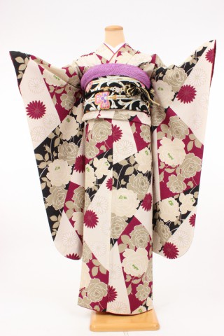 104-M-gaw0014 振袖レンタル Mサイズ 白紫/変わり市松に薔薇 振袖 ~13号 ..