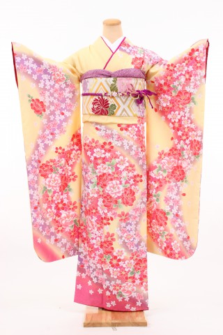 104-L-kaw0113 振袖レンタル Lサイズ ピンクに黄色/吉祥束ね熨斗文様 振袖 ~13..