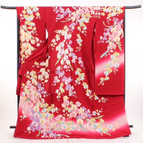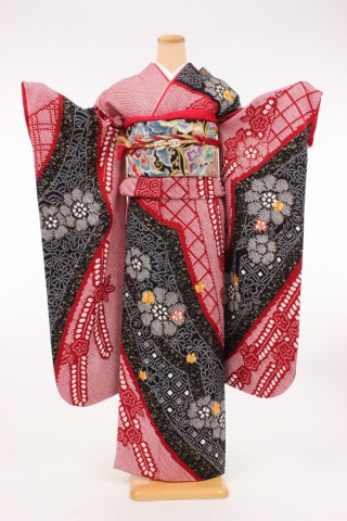 104-M-kaw0037 振袖レンタル Mサイズ 赤地に黒/絞り染風 吉祥柄に藤 振袖 ~13..