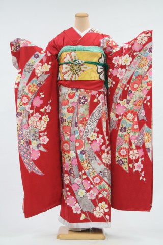 104-LL-kaw0075 振袖レンタル LLサイズ 赤/熨斗目模様に枝桜 振袖 ~13号..