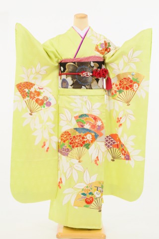 104-L-kaw0294振袖レンタル Lサイズ 黄緑/吉祥扇面図振袖 〜13号 お客様:K.S..