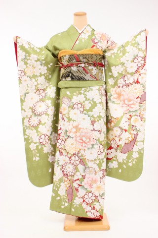 104-M-kaw0047 振袖レンタル Mサイズ 黄緑/熨斗目に百花 振袖 ~13号 お客様:..