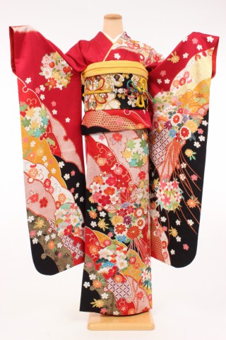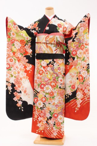 104-M-kaw0096 振袖レンタル Mサイズ 黒地/遠山流水草花文 振袖 ~13号 お客様..