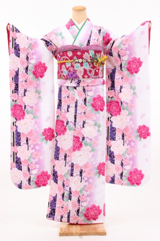 104-L-kaw0215 振袖レンタル Lサイズ 白地/切り絵牡丹 振袖 ~13号 お客様:O.M..