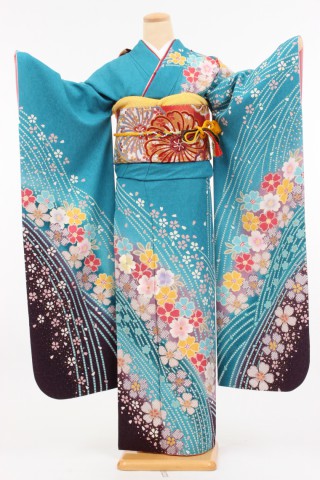 104-L-kaw0217 振袖レンタル Lサイズ おぼろ染め/青磁色/桜の滝 振袖 ~13号 ..