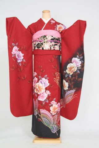 104-LL-kaw0016 振袖レンタル LLサイズ 赤地に黒ボカシ/幻蝶 振袖 お客様:K.K様..