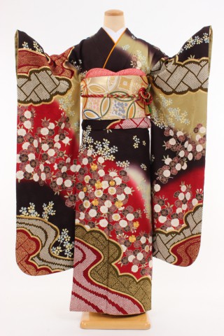 104-SO-kaw0006 振袖レンタル SOサイズ セピア/雲取り桜文様 振袖 13号〜15号 ..