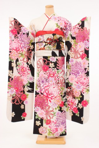 104-L-kaw0060 振袖レンタル Lサイズ 白黒市松模様/乱菊に桜散らし お客様:O.N..