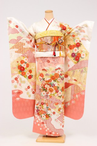 104-L-kaw0145 振袖レンタル Lサイズ 白ピンク/切継ぎ吉祥文様 お客様:Y.Y様 北海..