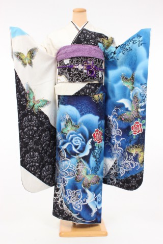 104-M-kaw0024 振袖レンタル Mサイズ 白地に青/夢薔薇に蝶 お客様:S.K様 ..