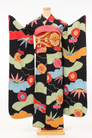 104-LL-kaw0011 振袖レンタル LLサイズ ☆ファッションカンタータ出品柄☆ 黒/松竹梅..