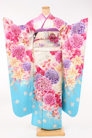 104-LL-kaw0042 振袖レンタル LLサイズ 白に水色/牡丹と百合 お客様:K..