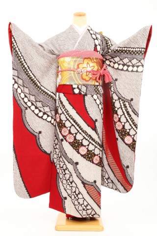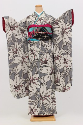 104-M-gaw0133 振袖レンタル Mサイズ モノクロ/大百合/和風館 お客様:M.Y様 千葉..